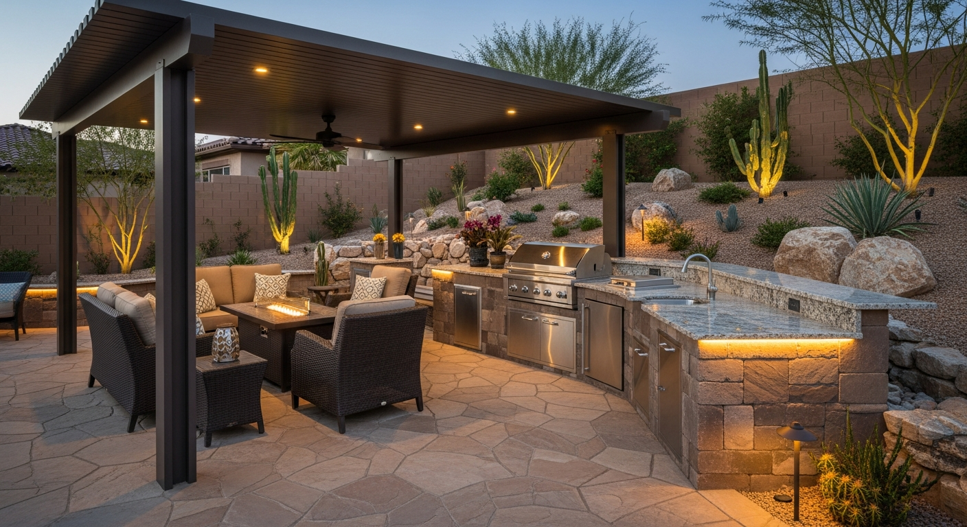 We use materials specifically rated for desert conditions—stainless steel, granite, and masonry that withstand extreme heat and UV exposure.